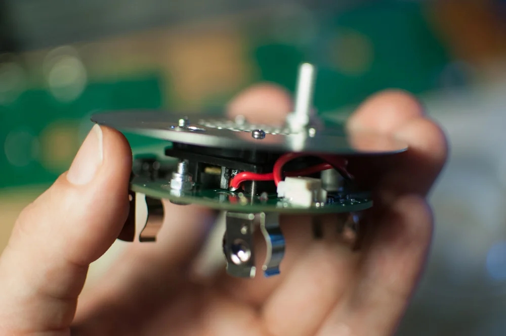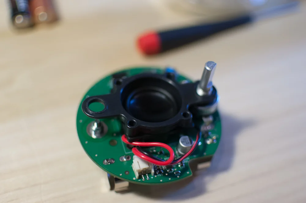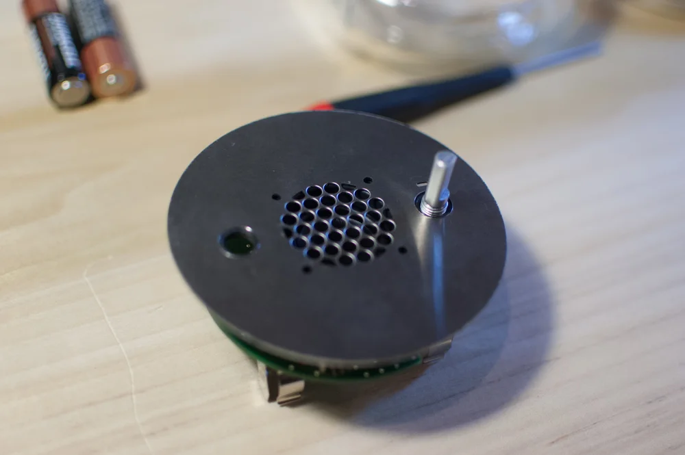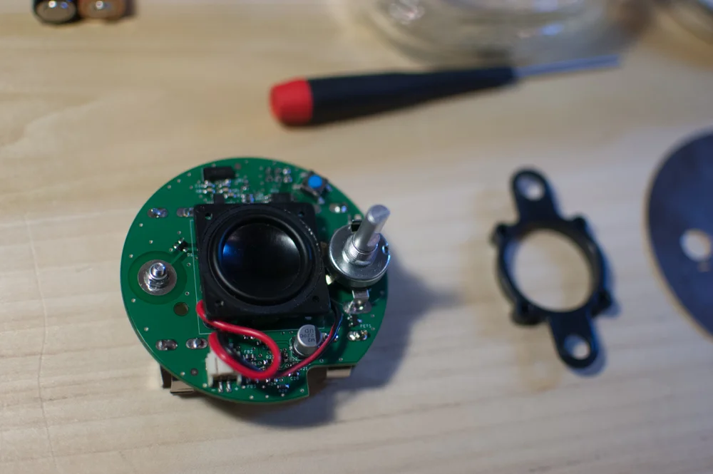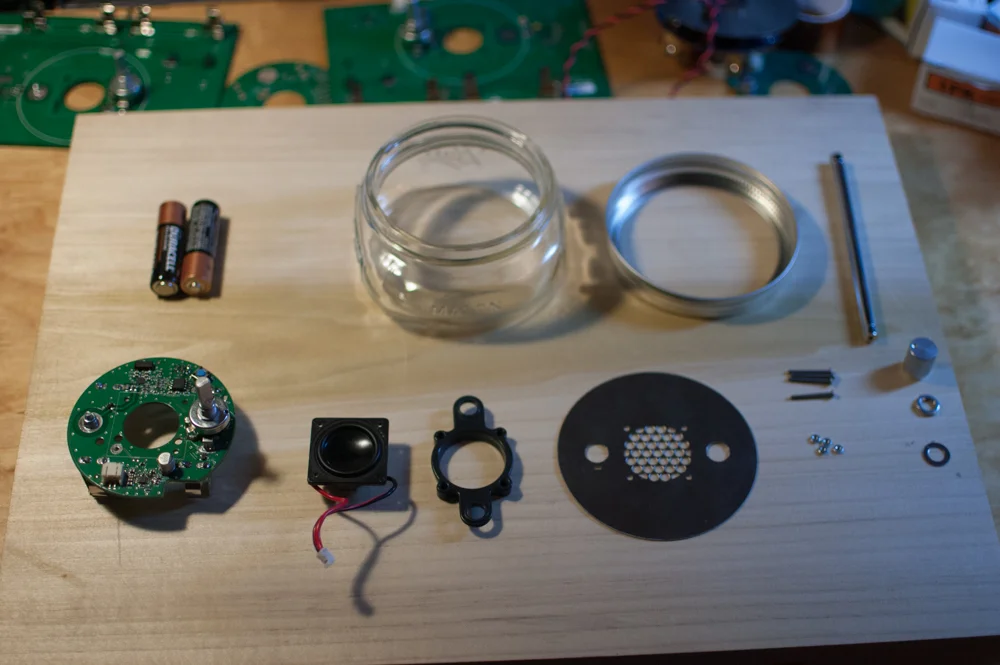 We start with a fully assembled PCB, a speaker, a spacer, a lid, some nuts & bolts, the potentiometer washer & nut, the knob, batteries, jar, ring and antenna.