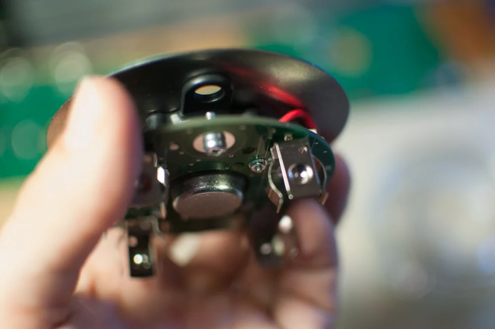 Loosely install the potentiometer washer and nut. Then install the small screws through the lid, spacer, speaker and PCB and thread nuts on their ends.