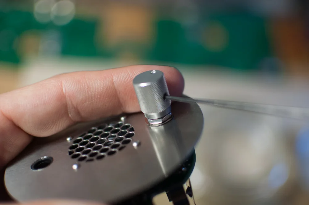 Once all the screws are installed loosely, snug up the nuts and then the potentiometer washer and nut. Then install the knob, making sure the set screw is facing the flat portion of the potentiometer shaft.